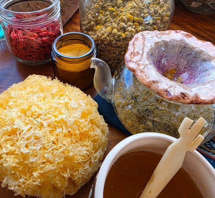 Su fórmula une la sabiduría de la Tremella fuciformis, hongo medicinal reconocido por ser un precursor natural del colágeno, con flores de manzanilla y caléndula, que calman la inflamación, regeneran tejidos y acompañan los procesos de reparación interna.